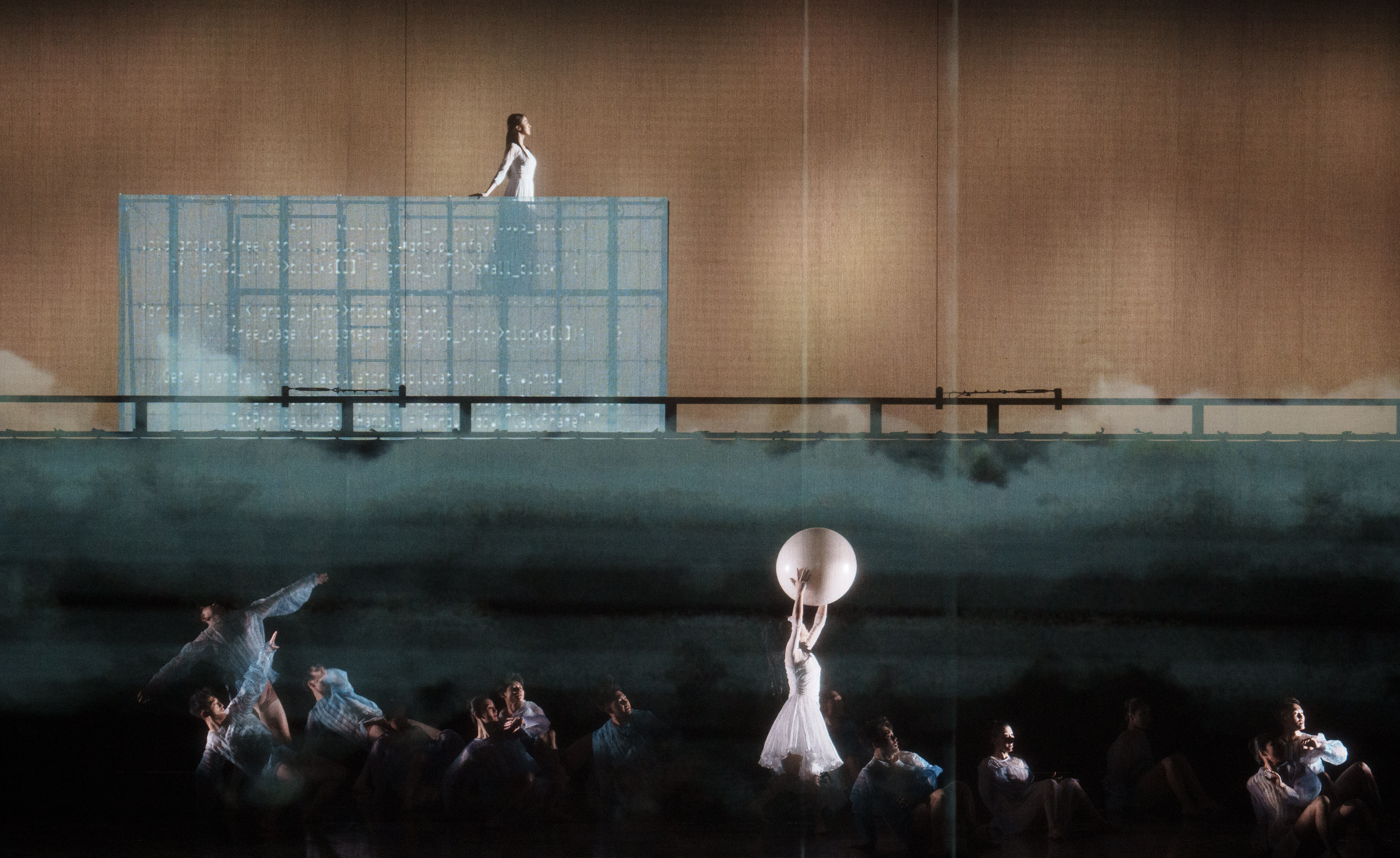 第一篇章《詩意地棲居》,運用舞蹈與各類視覺藝術交融的方式,編織出一個浪漫夢幻的詩意棲居之所,青山日出、綠水環(huán)繞、瑩瑩藍天、汩汩草浪,是廣闊天地之下是對美好生活的希冀,以一種詩意的生活方式讓人獲得內心的滿足和恬靜。