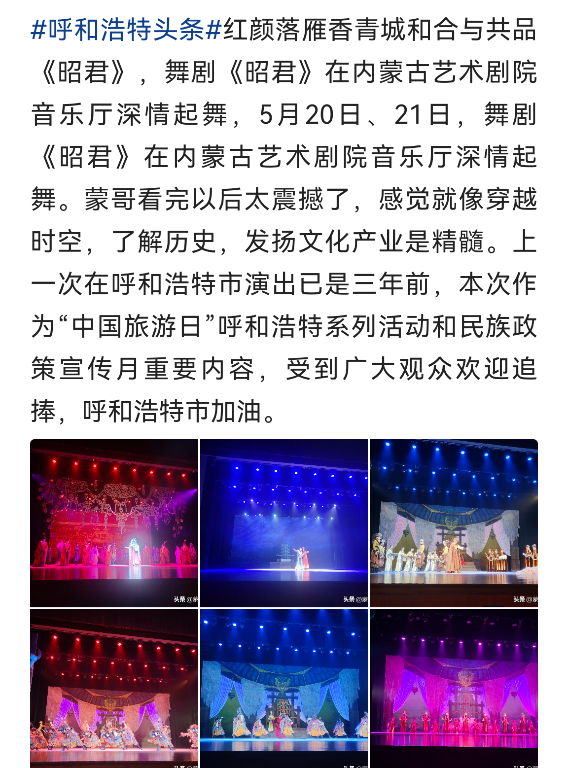 ? ? 演出同時得到了新聞媒體、社會各界的廣泛關(guān)注,央視新聞、人民網(wǎng)、文旅中國、內(nèi)蒙古新聞聯(lián)播、日報、融媒體等多家新聞媒體聚焦關(guān)注,今日頭條、抖音等網(wǎng)絡(luò)博主紛紛刊發(fā)觀后感“太震撼”“呼市作為歷史文化名城,昭君出塞的故事從小就是呼市人的文化記憶”“值得一看,希望呼市有越來越多很贊的文藝作品”。