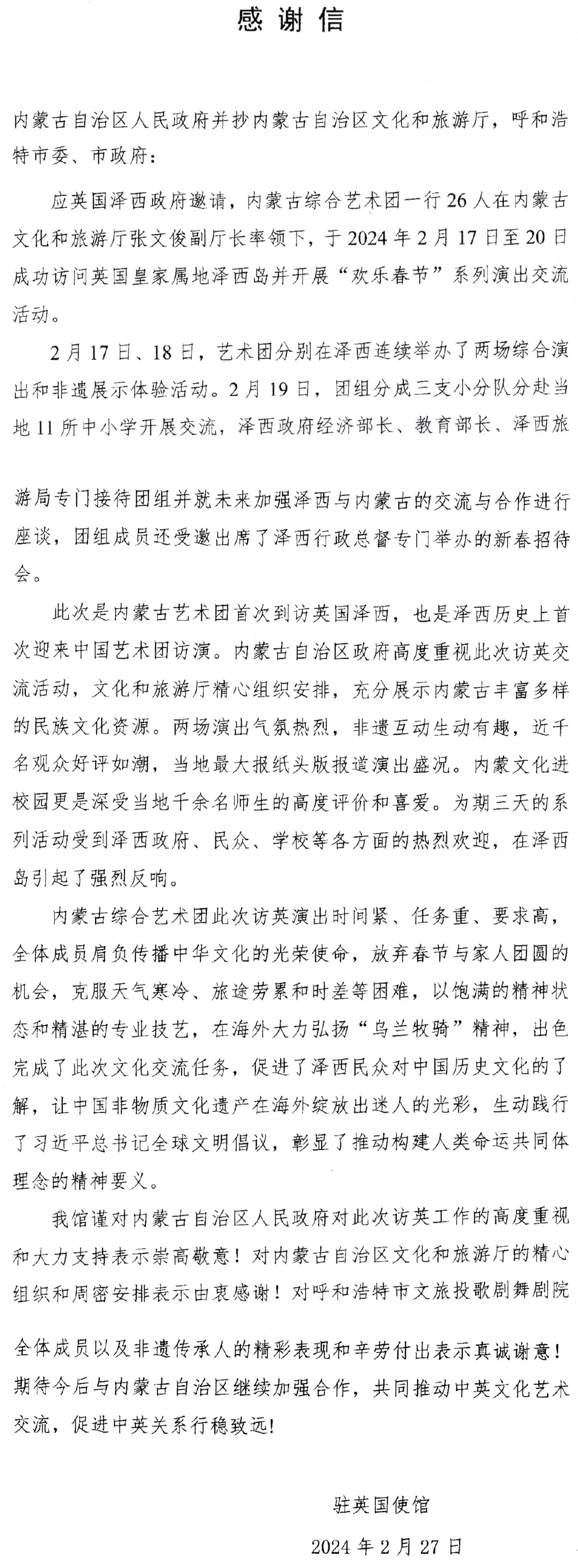 3月初收到駐英國使館感謝信,信中提到,此次內(nèi)蒙古綜合藝術(shù)團是英國澤西島歷史上首次迎來的中國藝術(shù)團,兩場演出活動好評如潮,在當?shù)刈畲髨蠹堫^條報道。內(nèi)蒙古文化進校園更深受當?shù)厍в嗝麕熒母叨仍u價和喜愛。出訪團在訪英演出時間緊、任務(wù)重、要求高,全體演職人員肩負傳播中華文化的光榮使命,以飽滿的精神狀態(tài)和精湛的專業(yè)技藝,在海外大力弘揚“烏蘭牧騎”精神,出色完成各項文化交流任務(wù),生動踐行了習近平總書記全球文明倡議,彰顯了推動構(gòu)建人類命運共同體理念的精神要義。