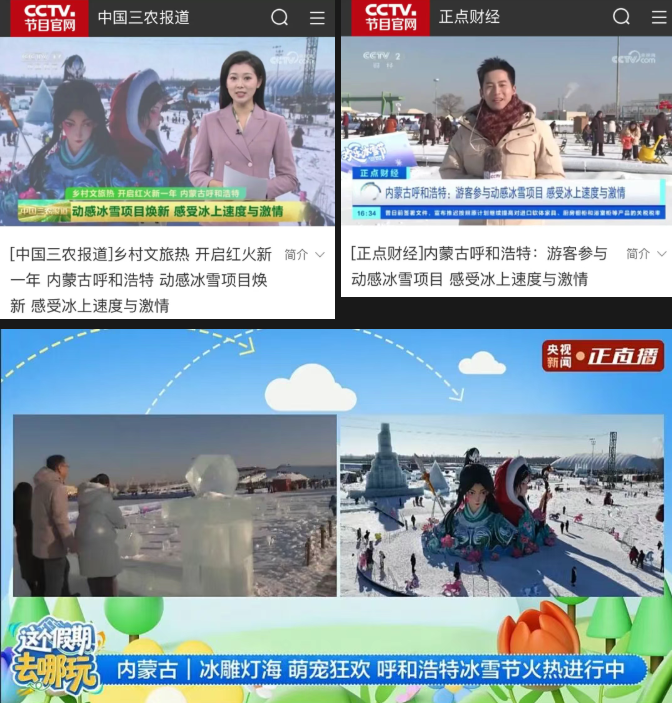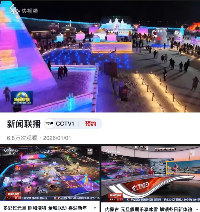 以“冰雪+非遺”為主題的跨年、元旦聯(lián)歡活動(dòng)還受到中央廣播電視總臺(tái)CCTV-1《新聞聯(lián)播》欄目報(bào)道。此外,央視《新聞直播間》《朝聞天下》等品牌欄目也對(duì)活動(dòng)予以報(bào)道,并在央視新聞客戶端開(kāi)展專場(chǎng)直播。8次央視新聞聚焦,10余家央級(jí)媒體、多家省市級(jí)主流媒體及主要商業(yè)平臺(tái)發(fā)布相關(guān)報(bào)道近千篇,形成多層次宣傳格局,將呼和浩特歡樂(lè)冰雪節(jié)推向全國(guó)視野。
